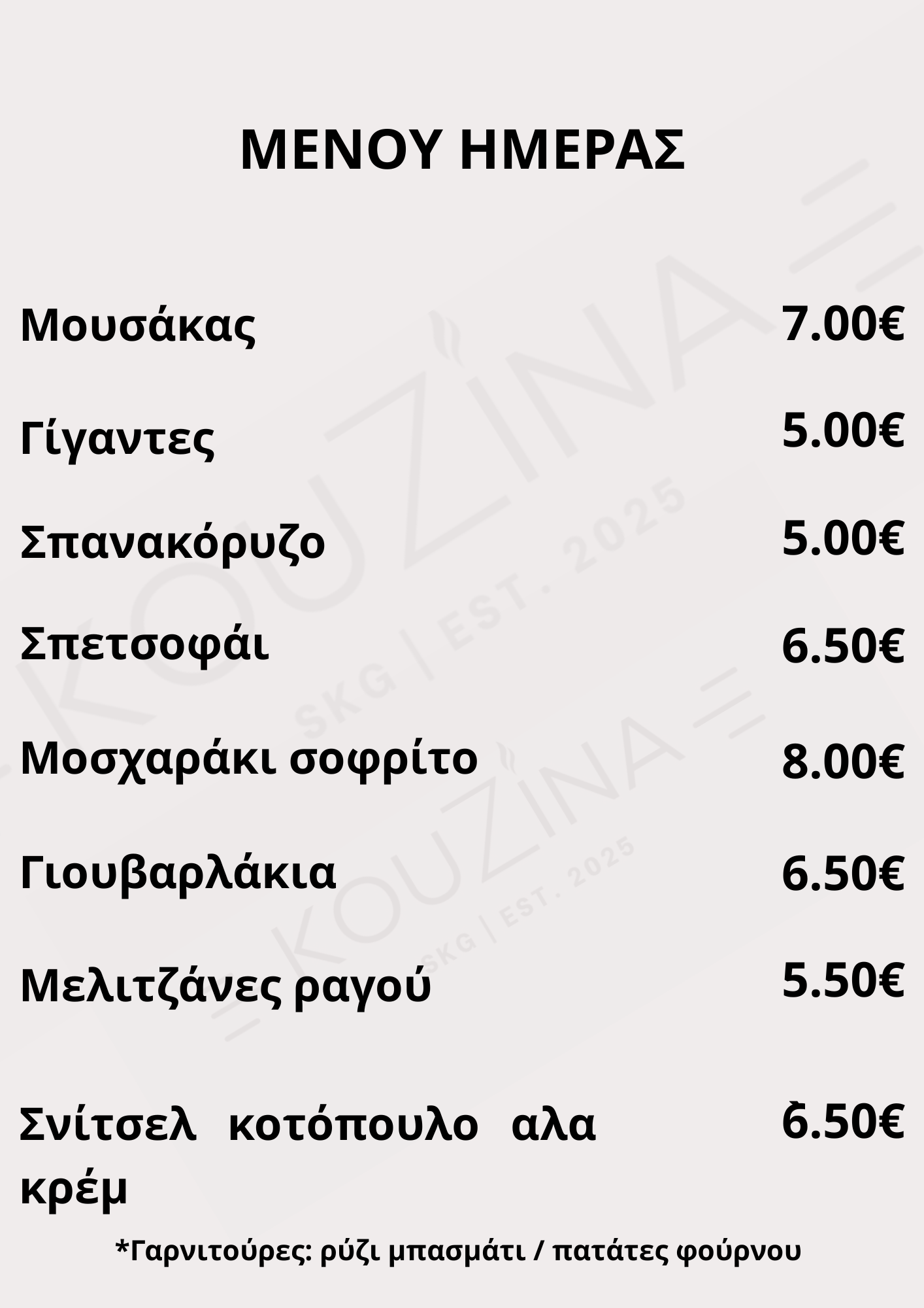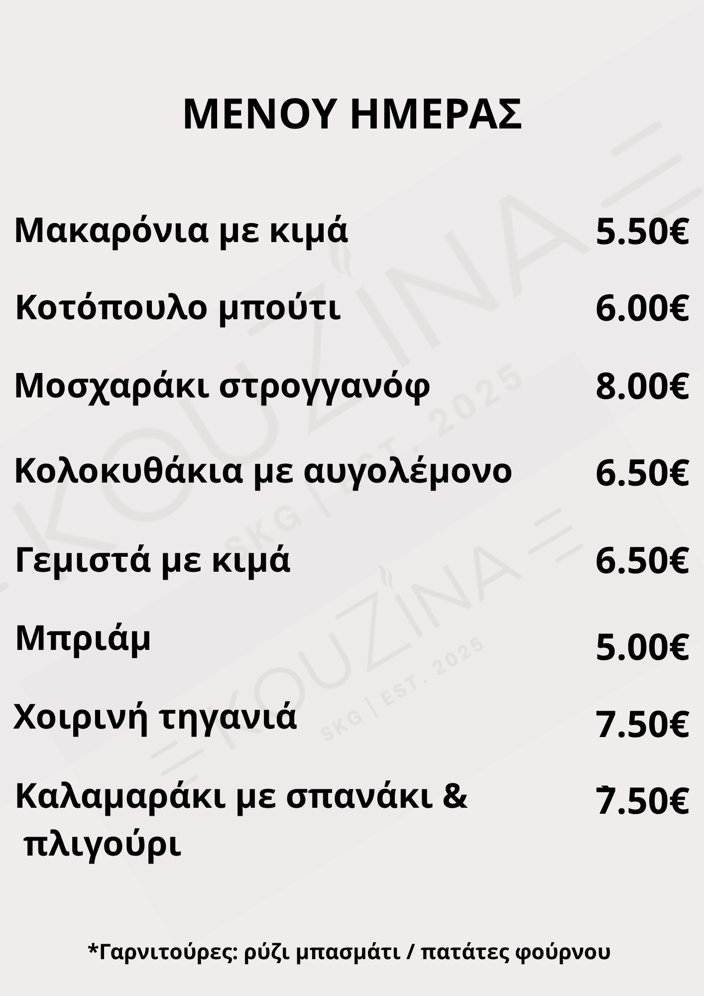 Κάθε μέρα, σας περιμένουμε με φρέσκες, ποιοτικές πρώτες ύλες και πιάτα που ξεχωρίζουν σε γεύση και φροντίδα. Απολαύστε σπιτικά μαγειρευτά που θυμίζουν μαμά, λαχταριστά ζυμαρικά με πλούσιες σάλτσες, δροσερές σαλάτες γεμάτες χρώμα και θρεπτικά υλικά, αλλά και πιάτα σχάρας ψημένα στην εντέλεια. Γεύσεις που ικανοποιούν και τον πιο απαιτητικό ουρανίσκο, σε ένα περιβάλλον ζεστό και φιλόξενο.